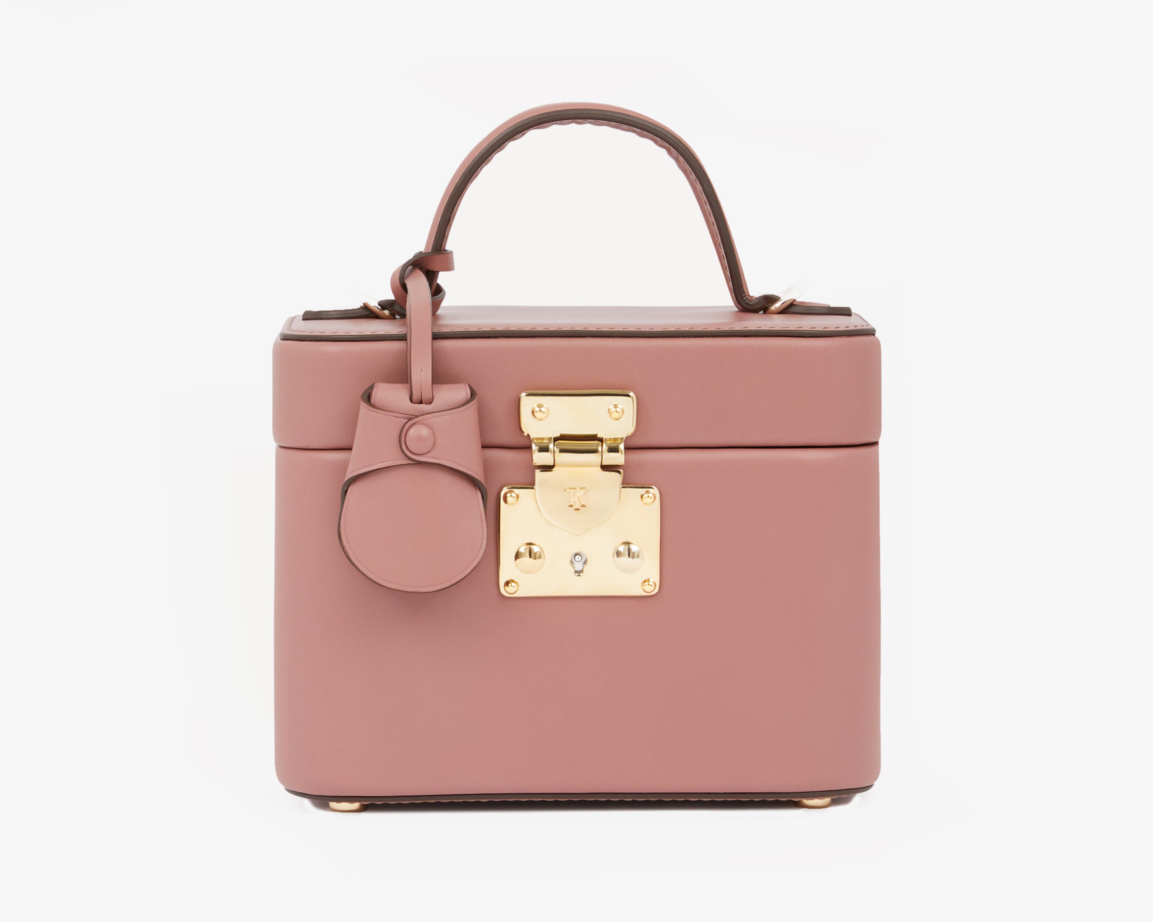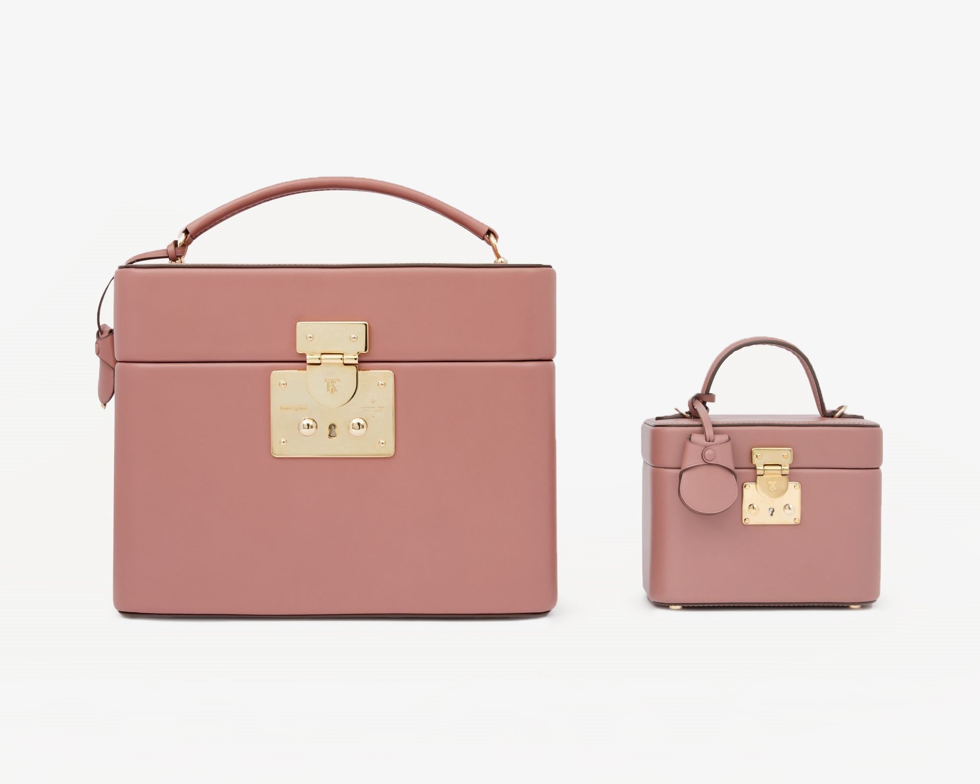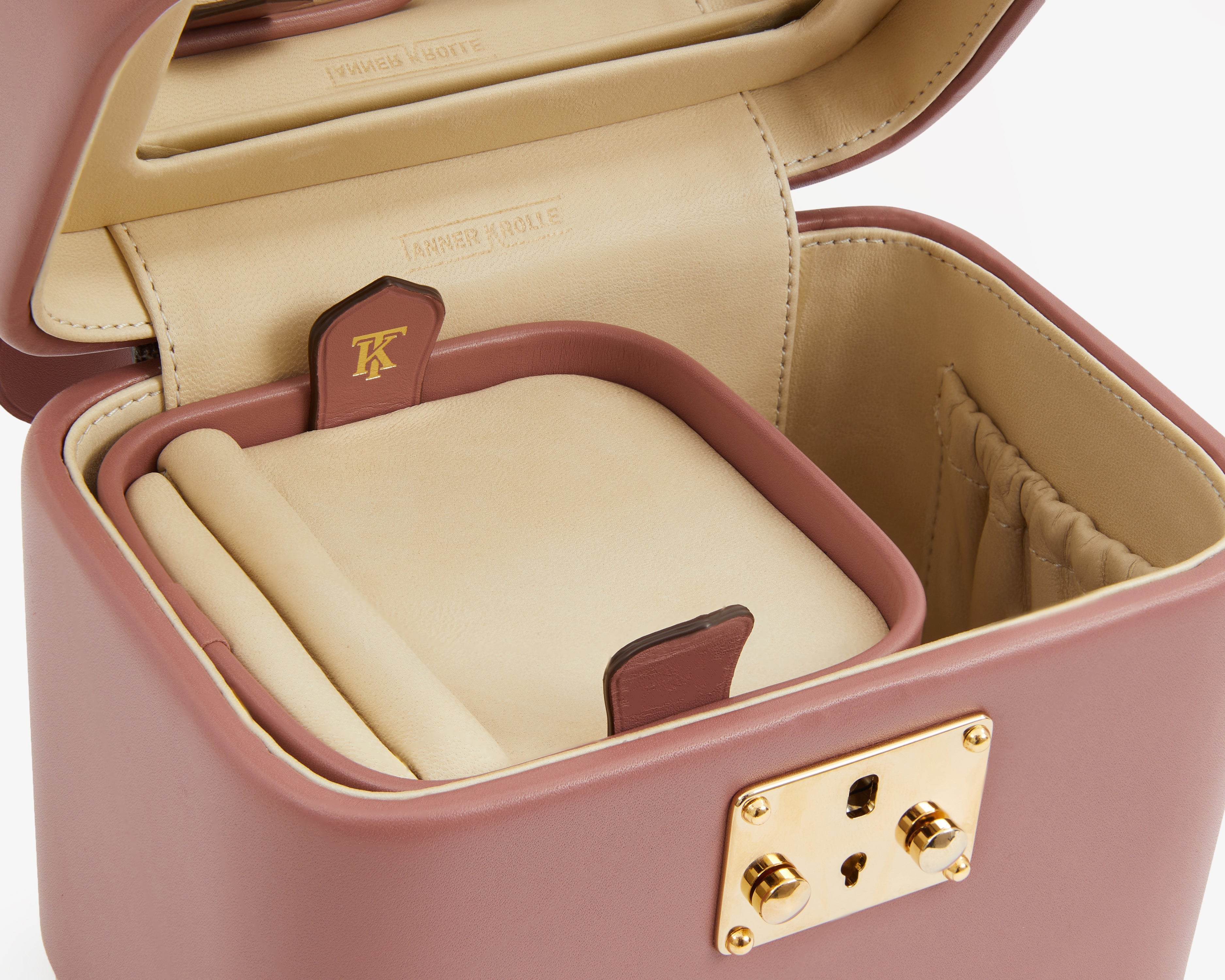 The Annabel Handbag shares the signature features of our larger Annabel Vanity case, including a vanity mirror, detachable jewellery tray, and signature gold TK lock. It also includes a top handle and detachable adjustable cross body strap for versatile wear.