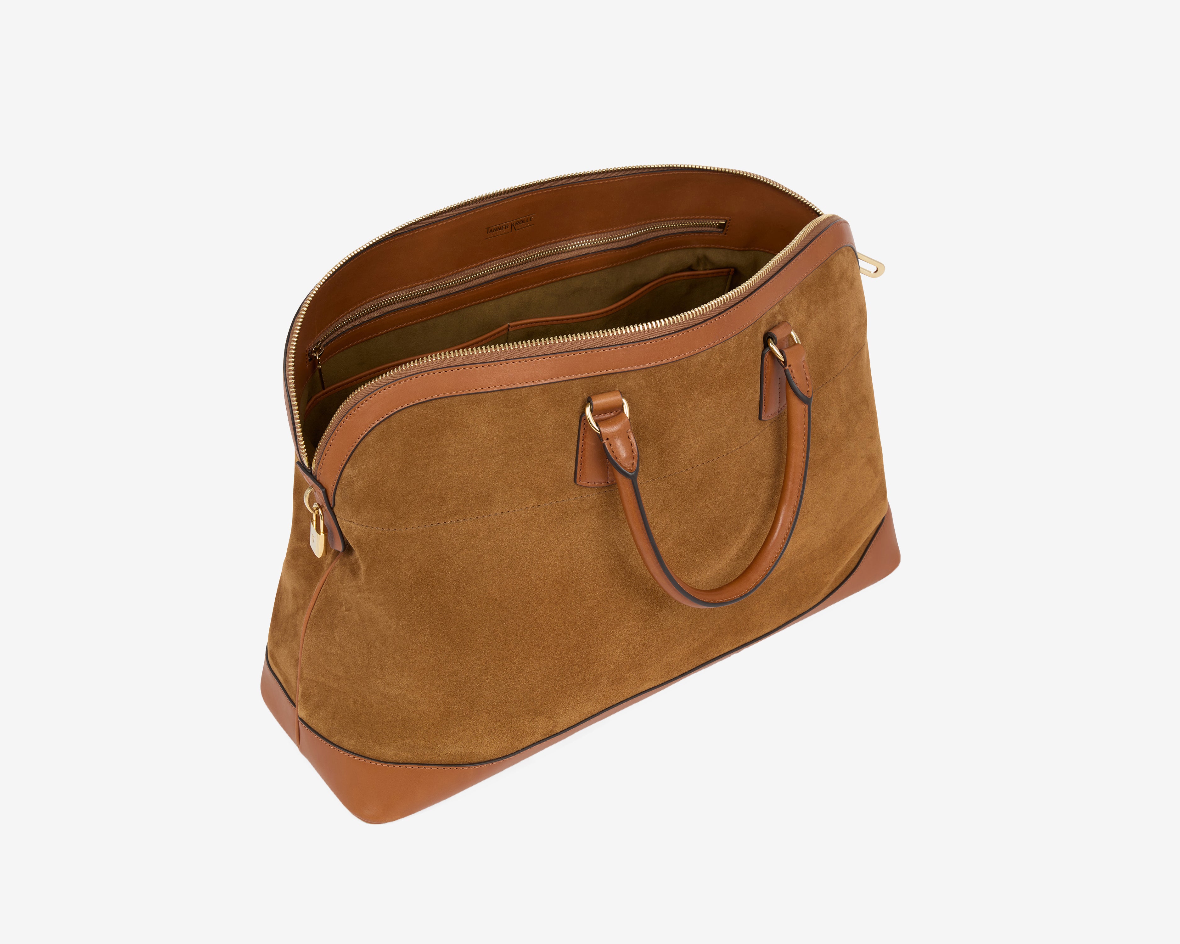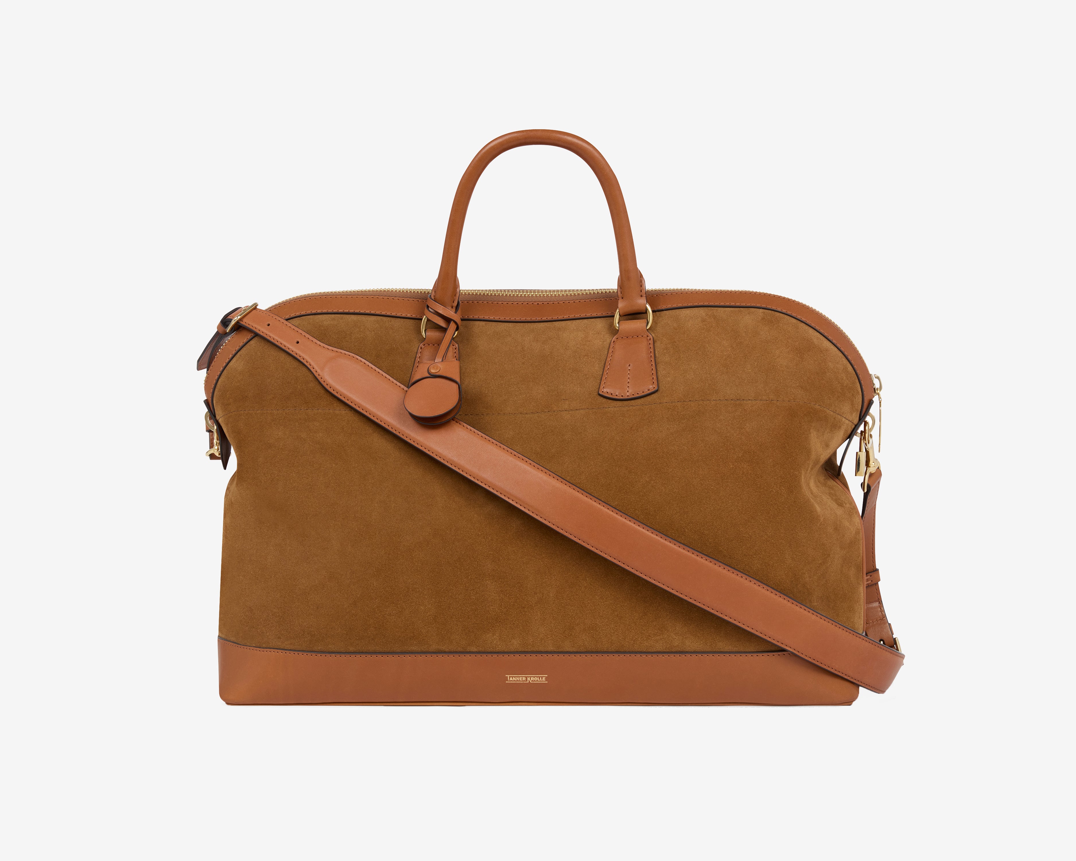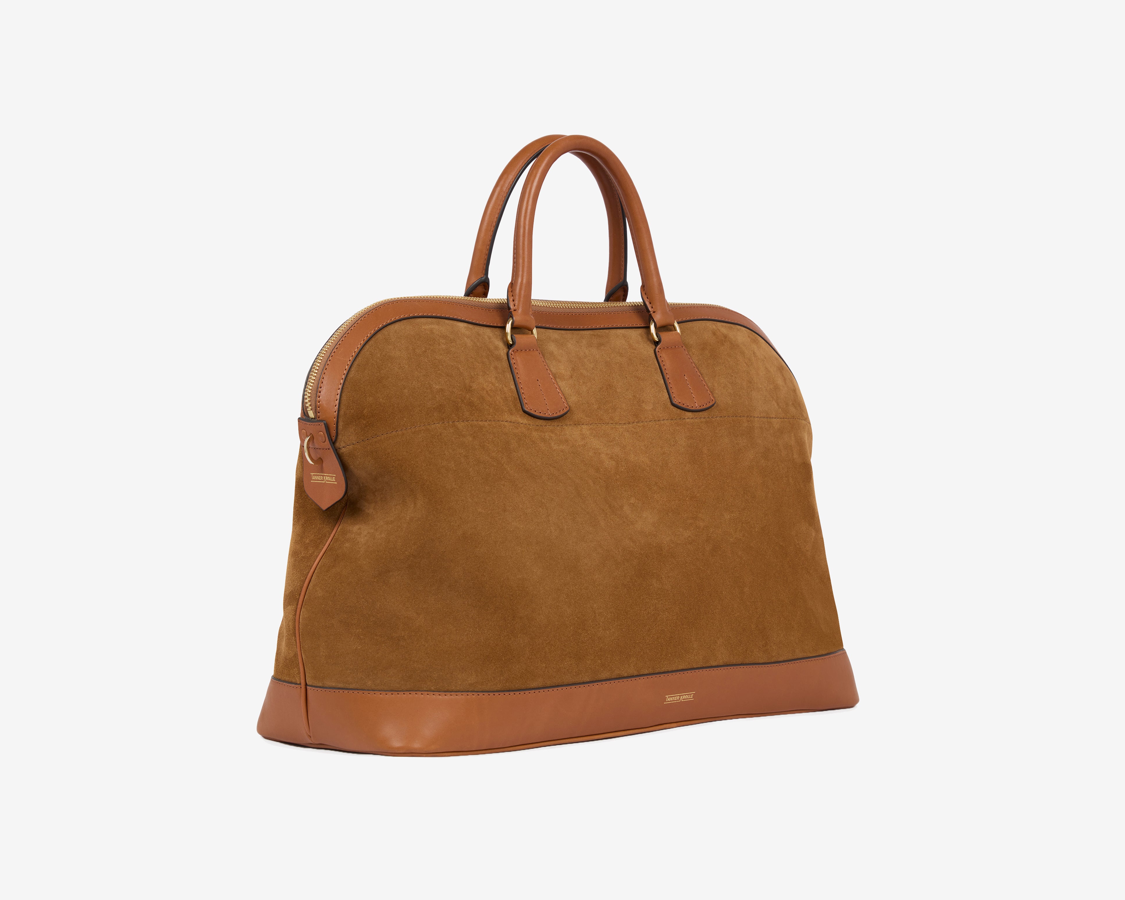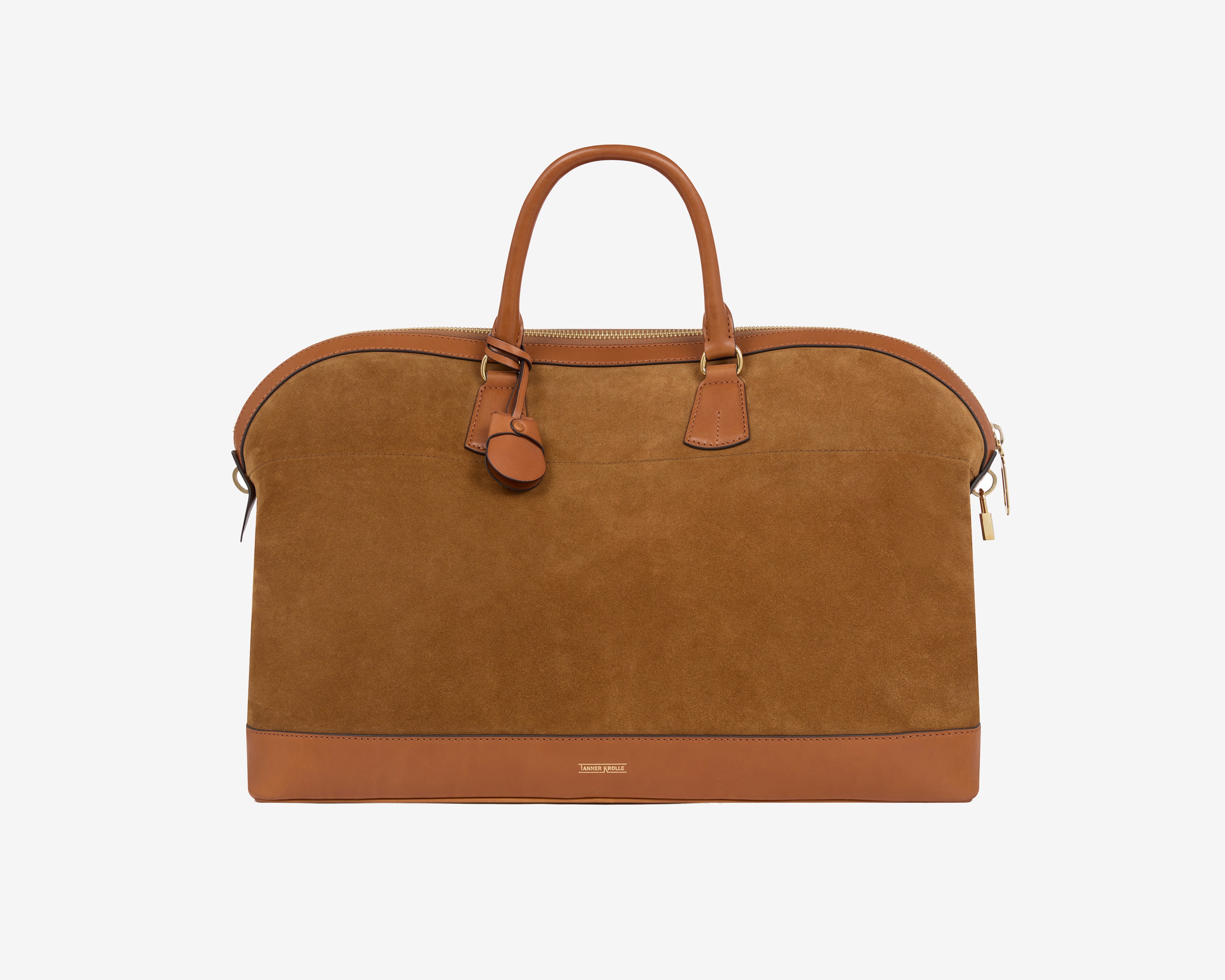 The Sportsman 48 Overnight in Saddle is a versatile unisex holdall. Crafted from soft suede with Baranil leather detailing, it features a zip pocket, slip pocket with press stud fastening, detachable shoulder strap, and signature elliptical closure.